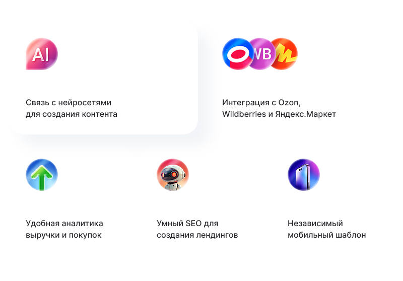 Впервые в решениях Аспро продукт включает в себя AI-технологии для создания контента и систему аналитики заказов. Это не только избавит от рутинных задач по сайту, но и поможет сосредоточиться на развитии бизнеса.